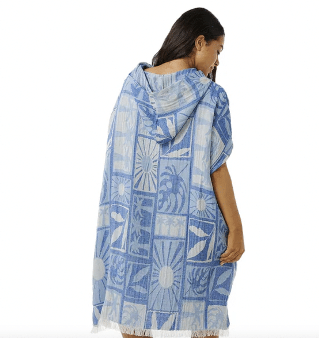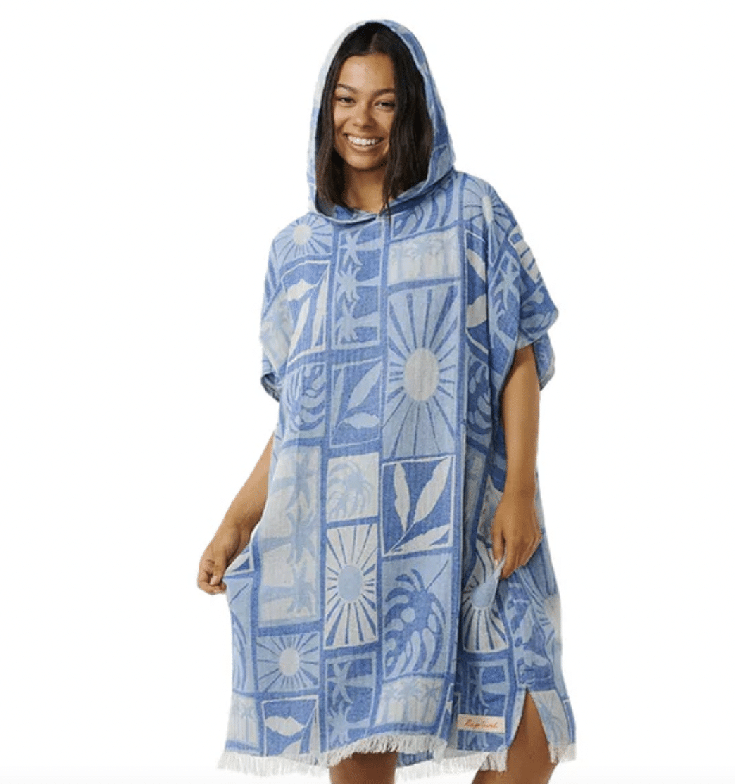 Stay sun-drenched and stylish with the Rip Curl Santorini Sun Hooded Towel in Blue. Whether you're at the beach or by the pool, this lightweight and absorbent towel will keep you dry and covered. The fun hood design adds an extra touch of quirkiness to your beach gear.
